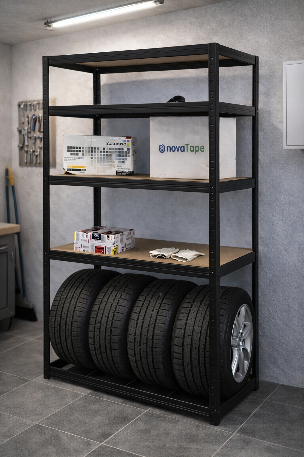 Opony stoją w regale na ziemi, dwie dolne wzdłużnice służą tylko do tego, aby opony samochodwe były dobrze przymocowane w miejscu. Opony nie można ułożyć na wzdłużnice. Mogło by dojść do ich odkształcenia.